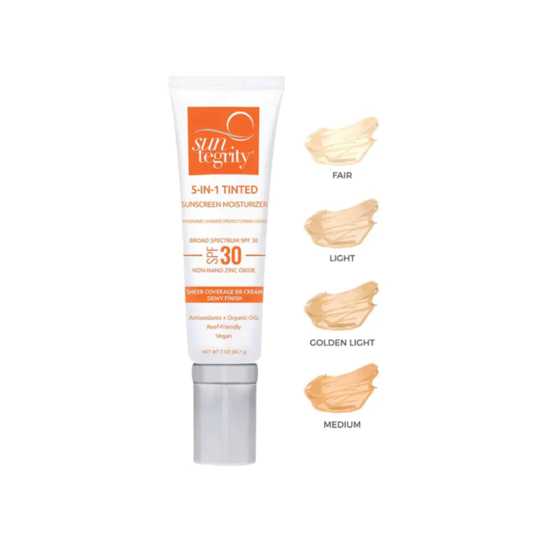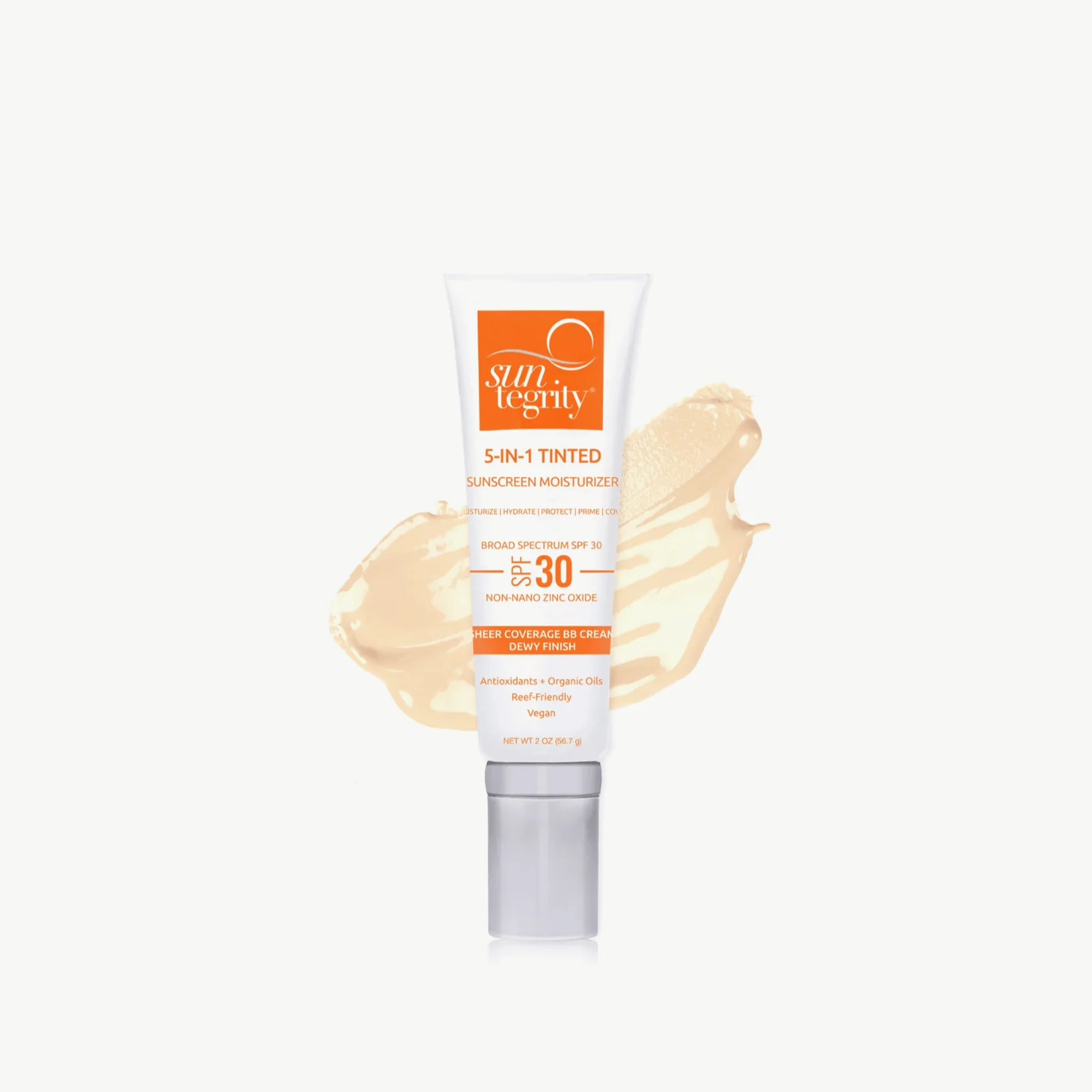 Discover the perfect blend of skincare and sun protection with Suntegrity’s 5-in-1 Tinted Sunscreen Moisturizer. This multi-tasking BB cream renews, hydrates, primes, and protects while delivering flawless coverage. Infused with powerful antioxidants, including Hyaluronic Acid and Astaxanthin, this cream helps to combat free radicals and promote healthy, youthful skin. The non-nano Zinc Oxide provides effective Broad-Spectrum SPF 30 protection against harmful UVA and UVB rays while soothing redness and irritation.
