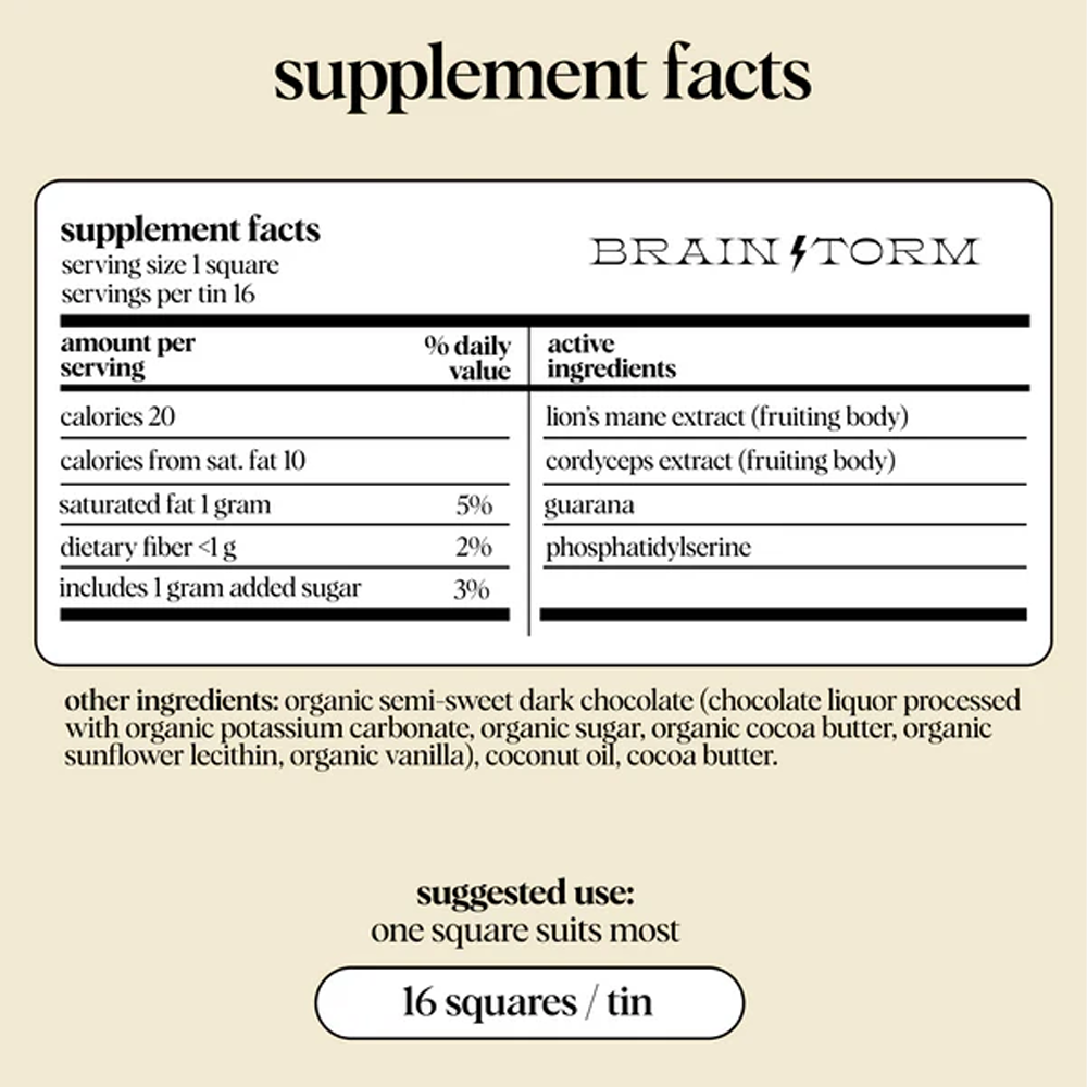 Enjoy one dose of Brainstorm when you’re in need of sharp focus or a clean boost of energy. Those looking for a stronger, more prolonged sensation may enjoy a double dose. One square suits most.