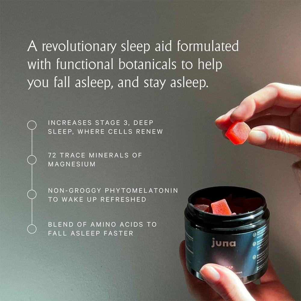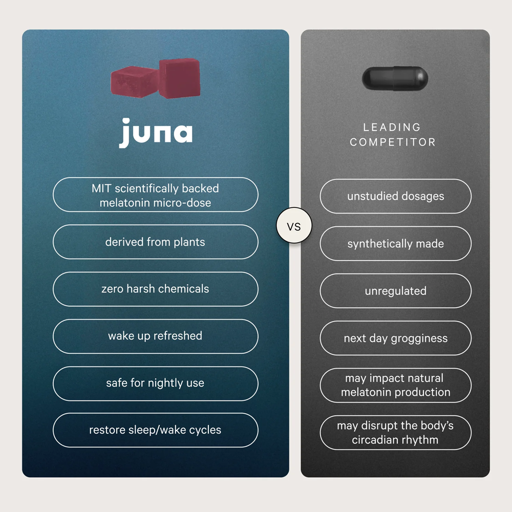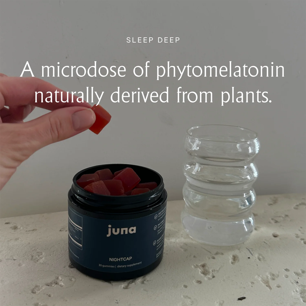- Non-Groggy Phytomelatonin: Unlike high-dose synthetic melatonin, Juna’s nightcap gummies contain melatonin derived from the plant St John’s Wort to support deep sleep without the “hangover”. Our microdose is science-backed to encourage your body's optimal production of melatonin, the hormone responsible for regulating sleep-wake cycles.
