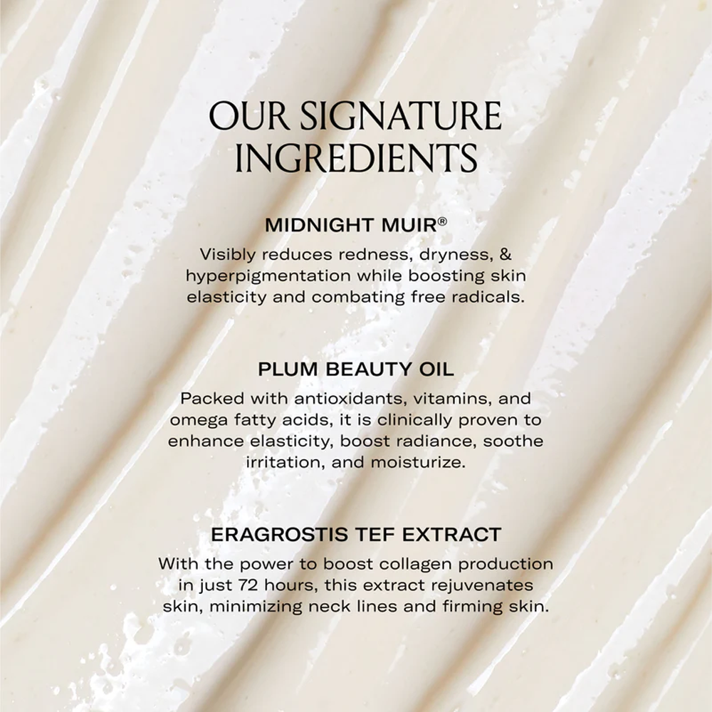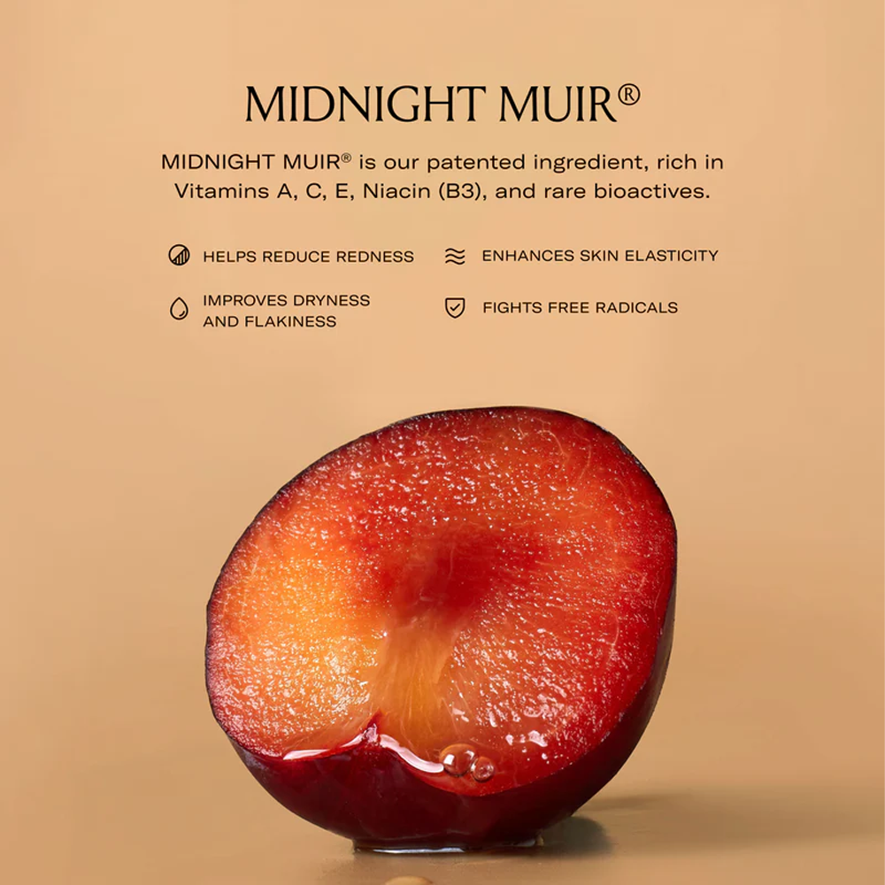 Midnight Muir® - A rare, patented plum extract rich in Vitamins A, C & E, and Niacin (B3), inspired by the Muir Beauty plum varietal on our family farm. This powerhouse works to help visibly decrease redness, dryness and hyperpigmentation while fighting free radicals and improving skin elasticity. Our optimized extraction process ensures bioactives are retained and is proudly 18x more powerful than standard dried plum extract containing Vitamin A.