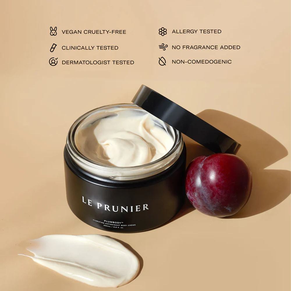 Discover the Power of Plum® reimagined as Plumbody™ – a clinically proven, velvety body cream to immerse the skin in antioxidant-rich, intelligent hydration. Powered by our signature Midnight Muir®, a rare patented plum extract exclusive to Le Prunier known to help visibly decrease redness, dryness and flakiness while fighting free radicals and improving skin elasticity.